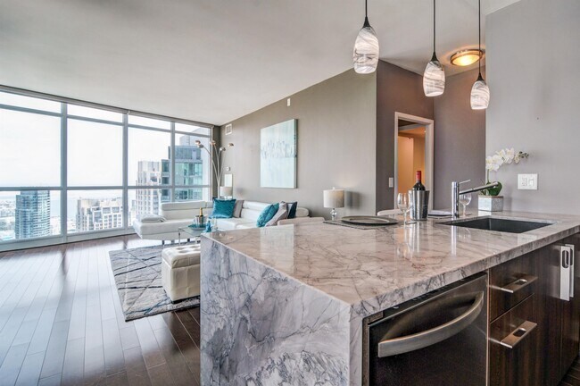 Imagine waking up to panoramic sunrises over Lake Ontario and the iconic CN Tower lighting up your night – this isn’t just a rental, it’s your ultimate urban oasis! This modern 2-bedroom penthouse boasts massive living space flooded with natural light from floor-to-ceiling windows wrapping around every corner.